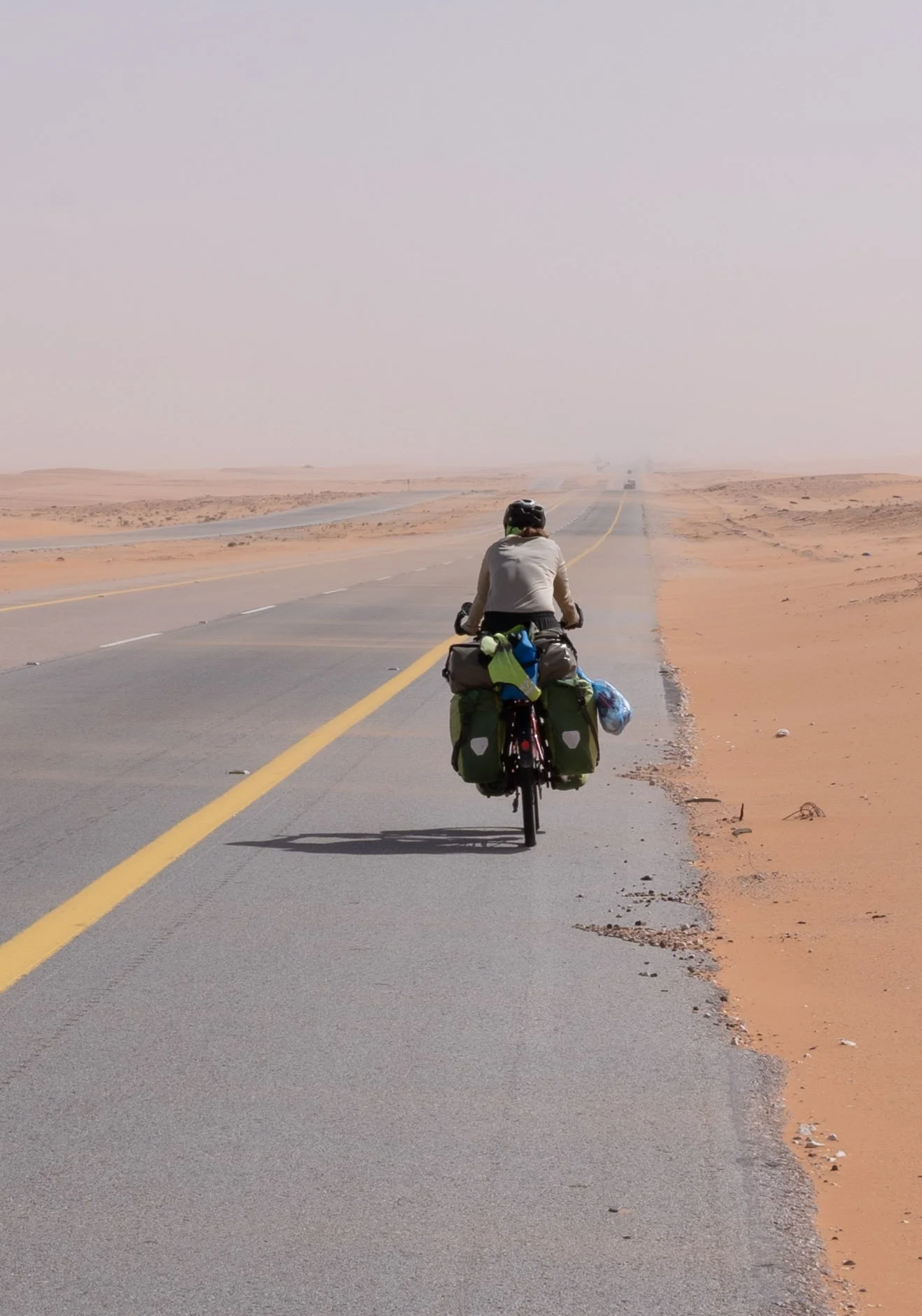 Östlich an Riad grenzt eine der größten Sandwüsten der Erde. Um zur Golfküste und den Vereinigten Arabischen Emiraten zu gelangen, mussten wir da durch. Aus dem Großraum der Stadt trieb uns noch ein günstiger Rückenwind raus. Zum ersten Mal seit dem letzten Sommer stand die Sonne aber nun mittlerweile so hoch, dass sie mittags schon ordentlich brannte, weshalb wir nach Möglichkeit wieder längere Mittagspausen einlegten. In einer dieser Pausen trafen wir den Vertriebsleiter einer niederländischen Firma, die Saatgut für Salat und Gurken anbietet. Das muss hier ein harter Job sein, denn die Nachfrage der Saudis nach Salat scheint unserer Wahrnehmung nach eher überschaubar zu sein… Al-Kharj war die letztere größere Ortschaft, nach welcher es erst noch durch eine Landwirtschaftszone und dann aber wirklich in die Wüste ging. Zu diesem Anlass drehte der Wind dann leider für einige Tage auf die Seite von Norden oder Süden, und das auch ziemlich kräftig. Das Hauptproblem lag neben der bremsenden Wirkung des Windes im Sand, der unablässig von links über die Straße und auf uns rauf geweht wurde. Wenn ein Lastwagen uns überholte, kam ein extra Schwall an Wind und Sand hinterher. Wir zogen uns Schlauchtücher tief ins Gesicht, um uns vor Sand und Sonne zu schützen. Sanddünen bis zum Horizont, und eine Straße mit einer der längsten Geradeausstrecken der Welt: Auf etwa 240 Kilometern keine einzige richtige Kurve! (Mittlerweile gibt es allerdings ein paar seichte Biegungen, wo die neue Straße an der Trasse der alten vorbeigeführt wird.) Auf diesem Abschnitt schienen wir bei den vorbeifahrenden Lastwagenfahrern Mitleid auszulösen, denn wir wurden hier auffallend oft zum Mittagessen oder zum Kaffee eingeladen oder Ladenbesitzer lehnten es ab, dass wir für unseren Einkauf bezahlen. Nachts wurden wir mit einem klaren Sternenhimmel belohnt. Eines Morgens wurden zwei große Kamelherden an unserem Übernachtungsplatz vorbeigetrieben. Sie kamen laut ihrem Hirten aus Dubai und marschierten nun wohl zu ihrem neuen Besitzer in Saudi-Arabien. Glücklicherweise konnten wir seit Riad auch wieder ganz ohne Eskorte unterwegs sein. Erst kurz vor der Golfküste wäre es fast ganz vorbei gewesen: Wie so oft hielt eine Polizeistreife hinter uns. Dieses Mal aber wirkte der Fahrer irgendwie strenger und packte erst einmal demonstrativ seine Kalaschnikow vom Beifahrersitz auf die Rückbank seines Fahrzeugs. Er deutete sofort auf die Räder und die Ladefläche seines Autos – Ende, wir sollten alles in sein Fahrzeug verladen. Wir vermittelten ihm per Google-Übersetzer, dass es sehr bitter wäre, so kurz vor der Golfküste auf ein Auto wechseln zu müssen – er gab nach. Etwas missmutig ließ er uns fahren. Vor der Grenze zu den Emiraten tranken wir noch einmal einen sehr guten saudischen Kaffee, dann ging es recht zügig rüber ins Emirat Abu Dhabi. Durch den Gegenwind kämpften wir uns bis zur ersten emiratischen Stadt (Al Sila). Der Ort hatte ein leicht anderes Klima als die Umgebung, etwas feuchter und kühler, was an der Meeresnähe und der reichen Bepflanzung gelegen haben dürfte. Direkt am Persischen Golf stellten wir unser Zelt auf - die Arabische Halbinsel war durchquert, vom Roten Meer zur Golfküste.